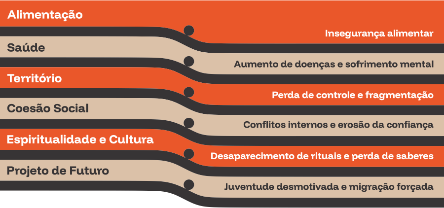 Impulsionados pela interação entre eventos climáticos extremos e pressões socioeconômicas, como a fragilidade institucional, o estudo mapeia os Pontos de Inflexão Social negativos que já estão em curso. O resultado são as Perdas e Danos Não Econômicos (NELD) que afetam as 6 Dimensões da Vida dos povos amazônicos: